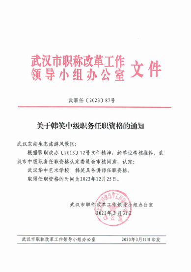 近日,从武汉市教育局、人社局联合下发的文件获悉,经武汉市职称改革工作领导小组办公室审议通过,我校有11名专职教师顺利通过职称评审,其中,韩校、雷莉亚获评中级职称,陈荣等9人获评助理讲师职称。
