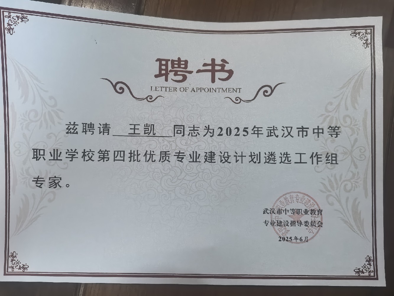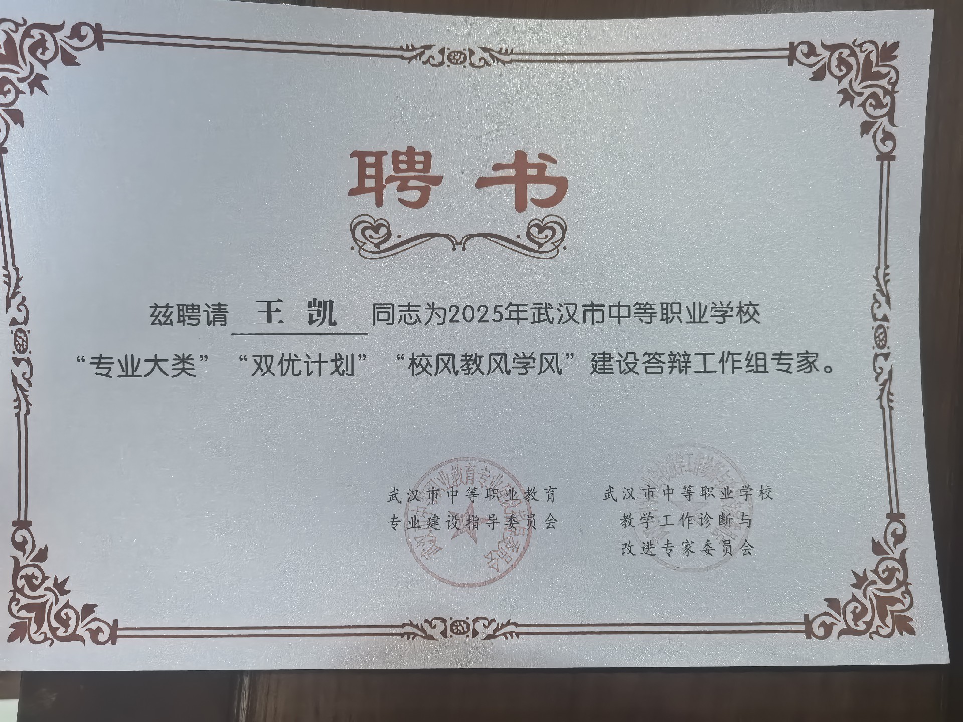 近日,从武汉市教育局中等职业教育专家建设指导委员会传来喜讯,我校校长王凯凭借在中等职业教育领域的深厚造诣与突出贡献,成功受聘为武汉市中等职业教育专家建设指导委员会专家,任期五年。